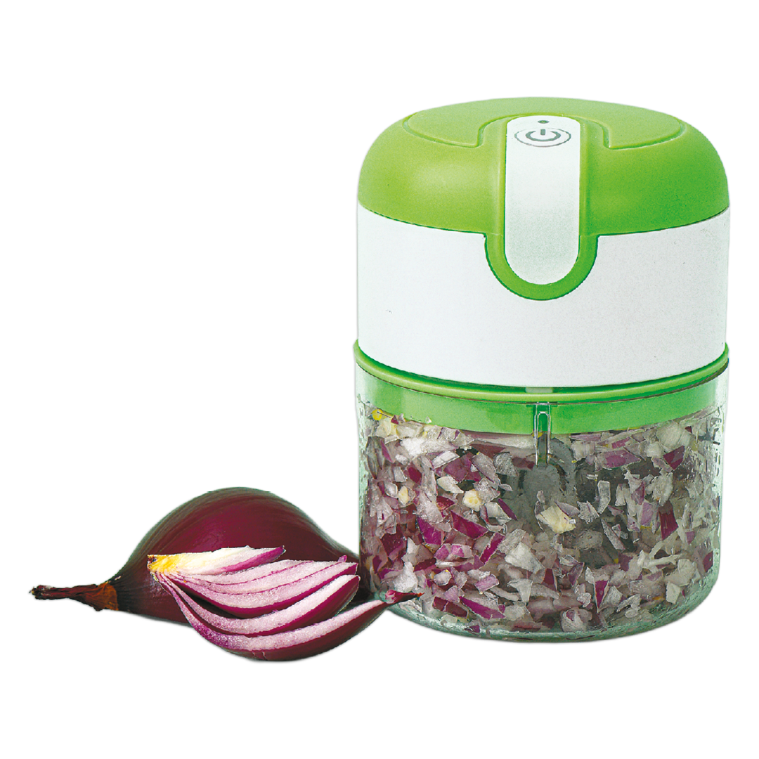 zerkleinern, schneiden und hacken, komfortable Einhand-Bedienung, zerkleinert Nüsse, Käse, Kräuter, Zwiebeln u. v. m., kabellos, hoch- wertige Edelstahlklingen, inkl. USB-Kabel, Behälter, Spritz- schutz und Klingen sind spülmaschinen-geeignet