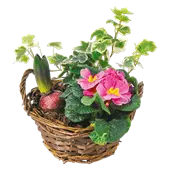Bepflanzter Holzkorb mit Frühlingsblumen