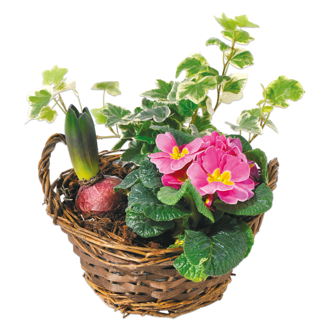 Bepflanzter Holzkorb mit Frühlingsblumen
