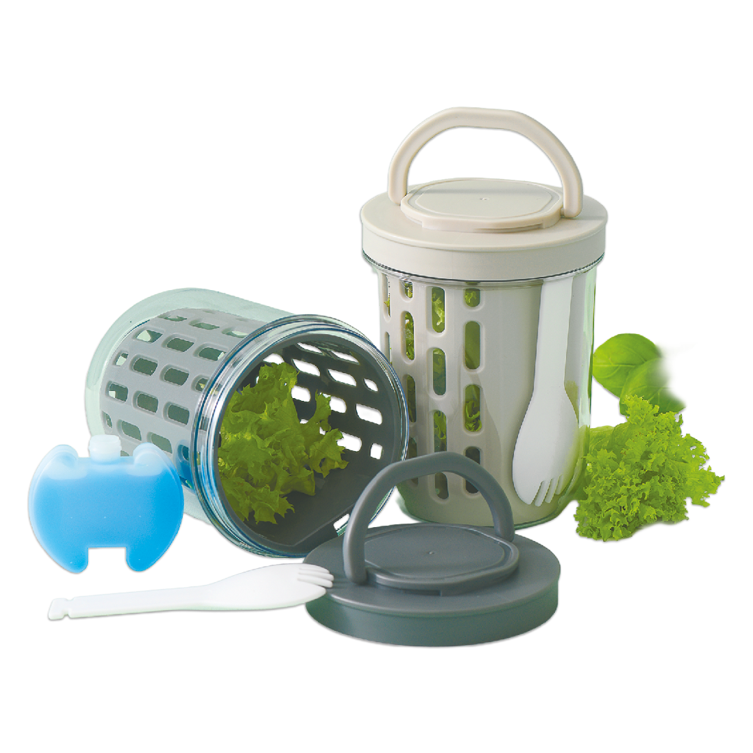aus Kunststoff, mit Löffel und herausnehmbarem Abtropfsieb, kleiner Kühlakku im Deckel integrierbar, Inhalt ca. 620 ml, versch. Farben