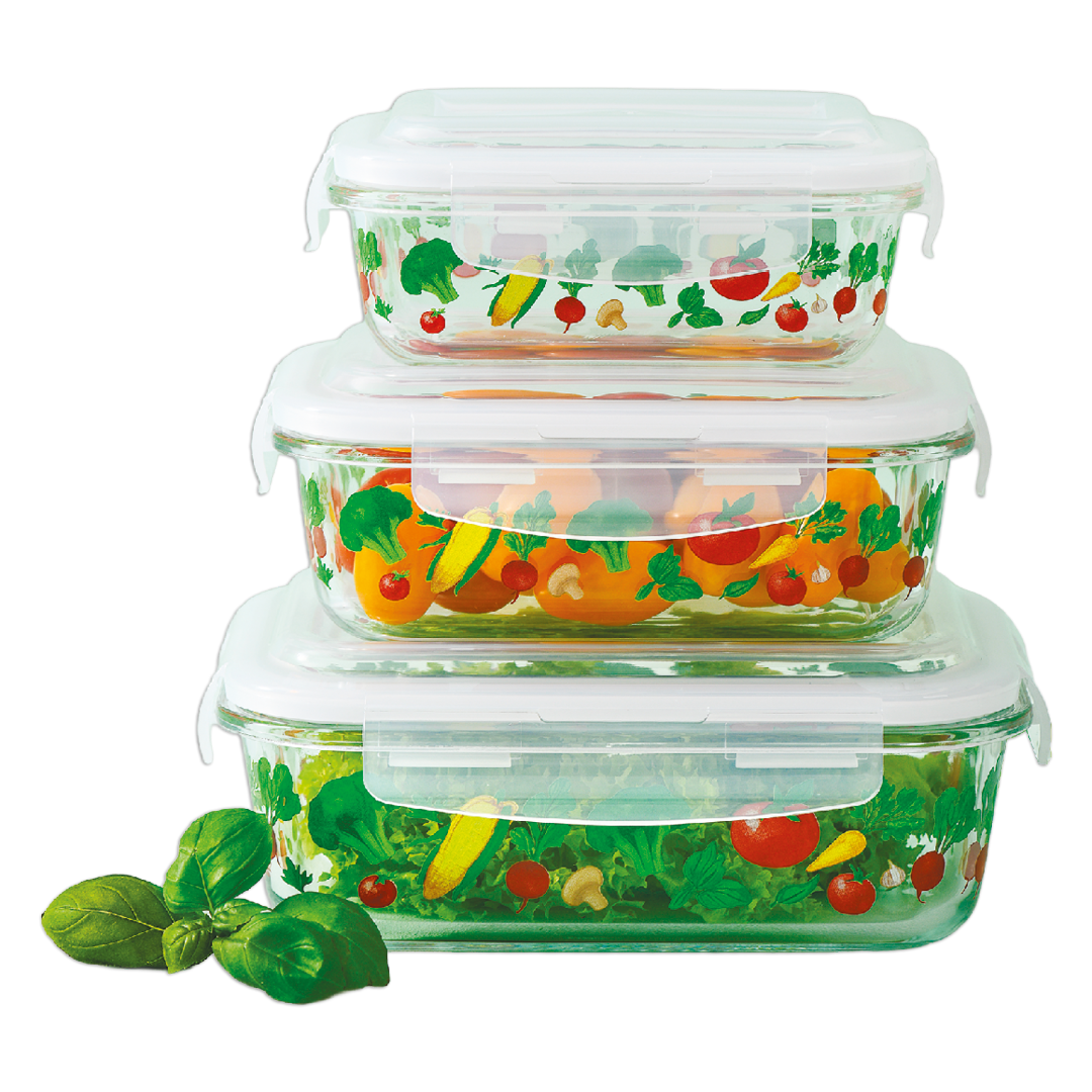Geschirr: z. B. Dose rund 1,5 Liter oder eckig 1,3 Liter, versch. Farben Deckel: ø ca. 25 cm