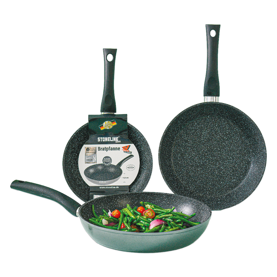 versch. Größen, mit original Stoneline-Antihaftbeschicht- ung mit echten Steinpartikeln, kratzfest, für alle Herdarten geeignet, auch Induktion • ø ca. 20 cm = 13.99 • ø ca. 24 cm = 14.99 • ø ca. 28 cm = 15.99