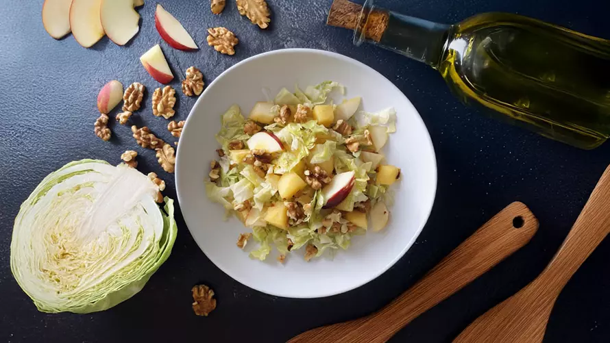 - Spitzkohl und Apfel kleinschneiden und mit Salz, Pfeffer und Chillipulver würzen