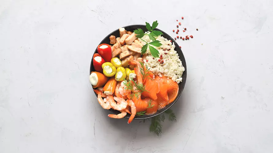 Fülle anschließend alle Zutaten in zwei dekorative Schalen, sodass alle Zutaten zu sehen sind.