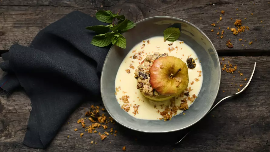 - Eine kleine Auflaufform mit Backpapier auslegen. Äpfel in die Form stellen und im vorgeheizten Backofen bei 180 °C (Umluft: 160 °C) etwa 25 Minuten backen.