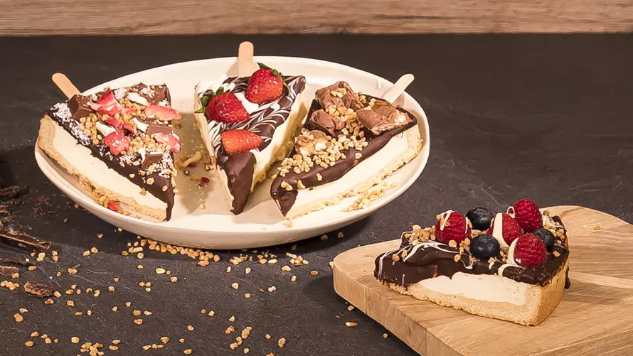 - Die Kuchenstücke mit Frischhaltefolie abdecken und für circa eine Stunde in den Gefrierschrank stellen.