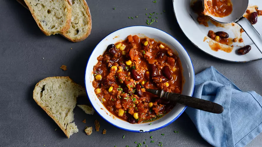 - Jetzt die Kidneybohnen, den Mais mit dem Maissaft aus der Dose, dem Tomatenmark, den gewürfelten Tomaten und etwas Wasser hinzufügen. Das Ganze bei mittlerer Wärmezufuhr zugedeckt etwa 20 Minuten weiterschmoren lassen.