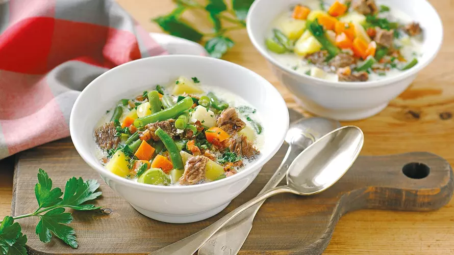 - Dann zusammen mit den Kartoffeln und dem Suppengrün wieder in die Fleischbrühe geben.