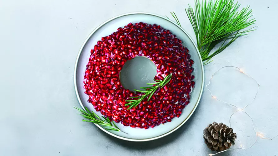 - Vor dem Servieren das Glas vorsichtig entfernen und den Schichtsalat mit Granatapfelkernen rundherum garnieren.