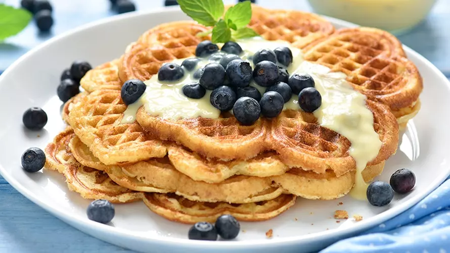 - Belege die Waffeln mit frischen Heidelbeeren oder Blaubeeren und Vanillesoße.