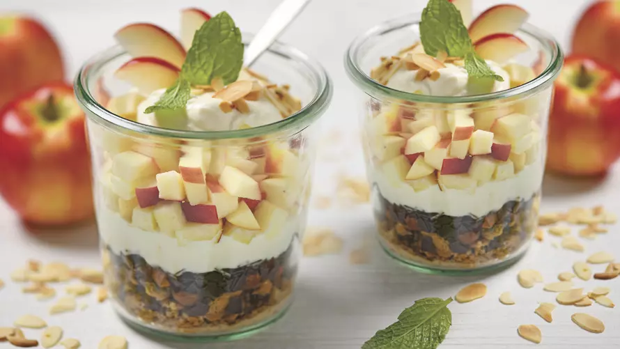 Du kannst zu der Apfelmasse auch Zimt hinzugeben. Und das ganze mit Minze und drei Scheiben Apfel dekorieren.