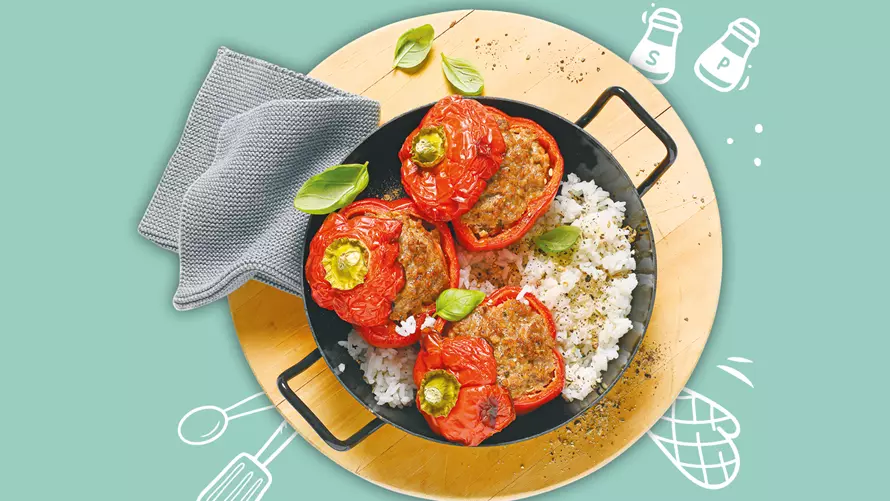 Die gefüllte Paprika mit Hackfleisch auf der mittleren Schiene bei 200 °C ca. 60 Minuten backen.