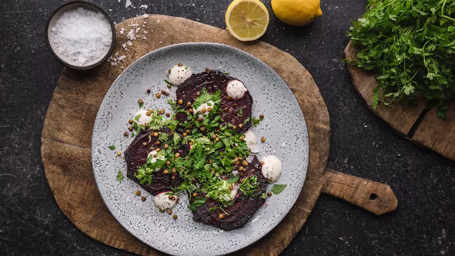 - Lege die gegrillten Rote Beete Scheiben auf einen Teller, beträufle sie mit dem Joghurt und der gebräunten Butter. Drapiere die Linsen und die gehackte Petersilie oben drauf.