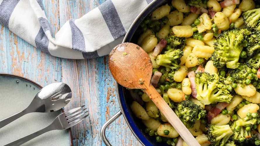 Sahne und Brühe zum Hackfleisch geben und erhitzen. - Brokkoli und Gnocchi in eine Auflaufform geben und mit der Hackfleischsauce bedecken.