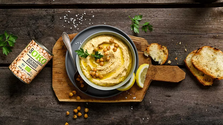 Nun die Kichererbsen, das Olivenöl, den Knoblauch und etwas Zitronensaft mit dem Standmixer fein pürieren. Alternativ können die Zutaten in einer Schüssel mit einem Pürierstab vermengt werden.