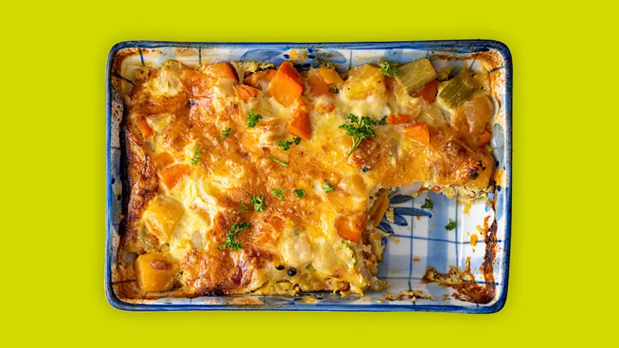 - Crème fraîche mit feiner Speisestärke verrühren, Schlagsahne, Milch, 25 g Gouda, Knoblauch und Gewürze unterrühren und gleichmäßig darüber gießen. Restlichen Käse aufstreuen.