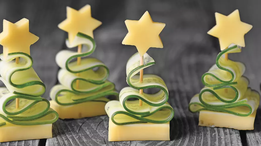 - Damit dein Gurkenbaum auch wie ein Weihnachtsbaum aussieht, nimmst du einen kleinen Sternausstecher und stichst wie beim Plätzchenteig aus dem restlichen Käse Sterne aus. Pro Gurken-Tannenbaum benötigst du einen Käsewürfel, einen Gurkenstreifen und einen Käsestern.