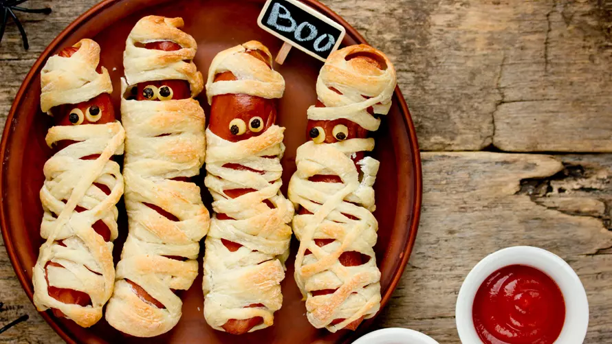 Lege die Wurst-Mumien auf das mit Backpapier ausgelegte Backblech. Bepinsel die Mumien mit der Milch. Die Mumien im vorgeheizten Ofen ca. 10-15 Min. bei 180° backen.