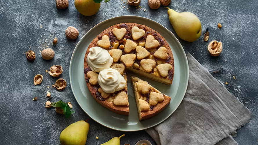 - Den Rest des Teiges ausrollen, Herzförmchen ausstechen und damit die Birnen bedecken