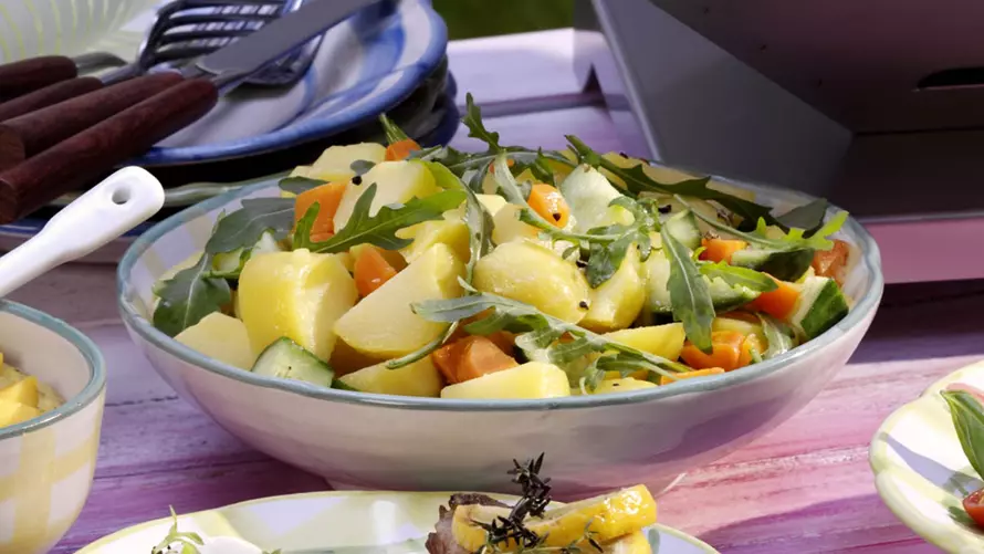 - Gurke abspülen und würfeln. Essig mit Salz, Pfeffer und Öl verrühren. Marinade unter die Kartoffeln und Möhren mischen. Nochmals abschmecken. Gurke und Rucola unterheben.