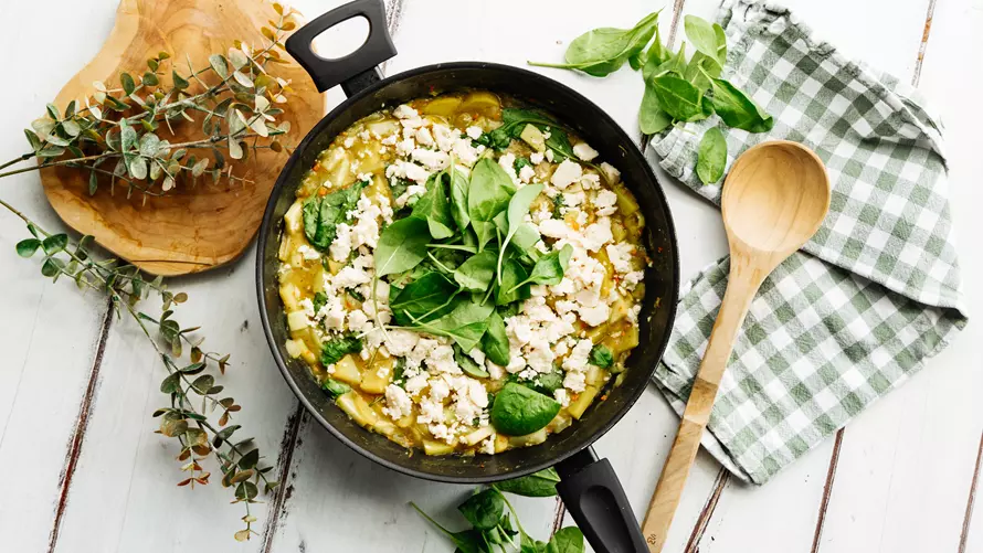 - Zwiebeln in Öl glasig dünsten, Kohlrabi und Kartoffeln zugeben und 5 Minuten anbraten.