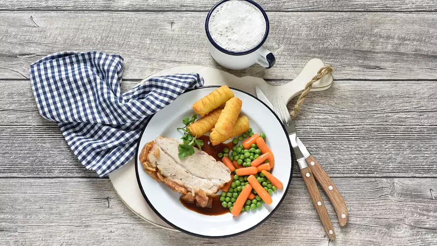 - Die Butter auf Zimmertemperatur bringen. Den Backofen auf 200 °C vorheizen. Die Schwarte kreuzweise ca. 2 mm tief einritzen. Das Fleisch salzen und pfeffern und rundherum anbraten.