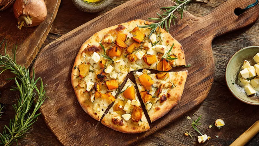 - Den Teig dann auf einem Backblech ausrollen, mit Crème fraîche bestreichen, mit Salz & Pfeffer würzen, die Kürbisstücke darauf verteilen und bei 220 Grad Umluft goldbraun backen.