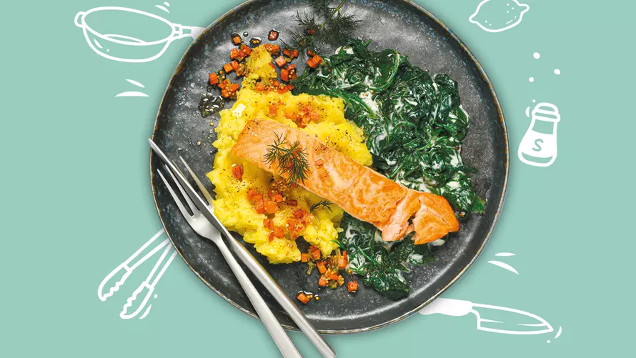 - Sonnenblumenöl in einer Pfanne erhitzen, die Lachsfilets auf beiden Seiten jeweils ca. 3 Minuten lang anbraten, dann würzen. Nun den Lachs auf den Spinat legen.