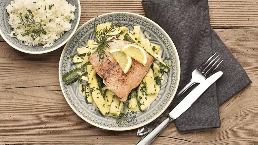 - Zucchini mit der Senfsauce auf 2 vorgewärmte Teller verteilen und das Lachsfilet dazu anrichten Mit Kräutern, rotem Pfeffer und Zitronenscheiben garnieren. Kräuterreis getrennt dazu reichen.