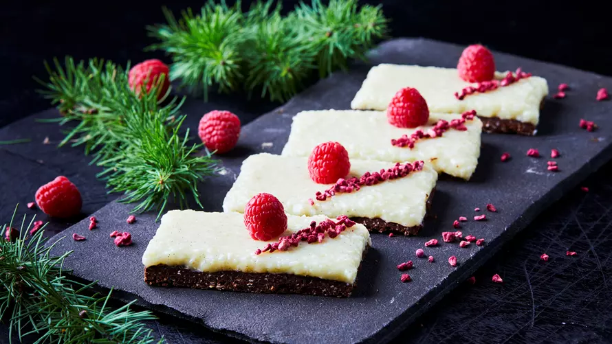 Abschließend die Oberfläche glatt streichen und mindestens für 3 Stunden in den Kühlschrank stellen. - Den Kuchen aus dem Kühlschrank nehmen und den Kuchen in kleine, schmale, rechteckige Stücke schneiden und auf einem Teller servieren. Diese Kuchenstücke können sehr gut mit Früchten wie Himbeeren angerichtet und verzehrt werden.