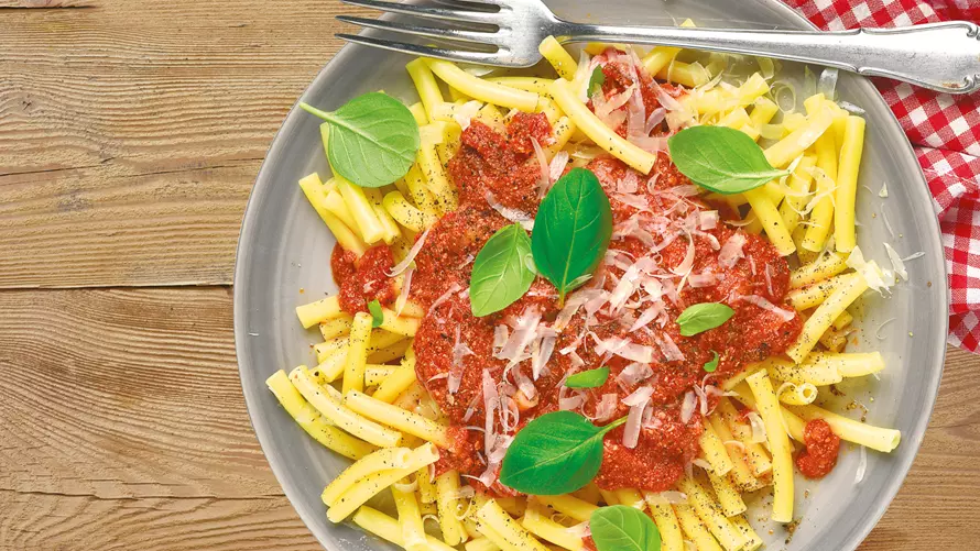 Ist die Sauce zu flüssig, kann man mit etwas Tomatenmark andicken. - Während die Soße gart, bereitest du die Nudeln nach Packungsanleitung zu.
