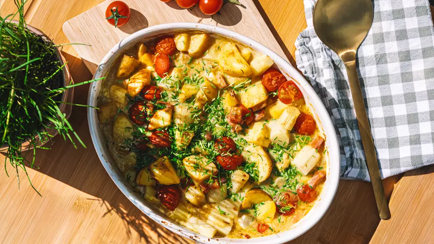 - Eine Auflaufform (ca. 30 x 25 cm) mit Öl auspinseln und Kartoffeln (ggf. klein schneiden), Tomaten, Schinken, Spargel und Béchamelsauce einfüllen und für 20 Minuten bei 180 Grad Umluft backen