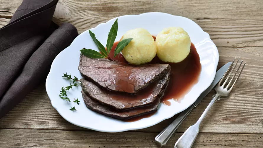 - Den Rinderbraten waschen, in eine Schüssel legen und mit Rotwein übergießen.