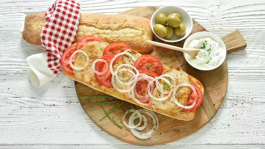 - Baguette halbieren. Jede Hälfte waagerecht durchschneiden.