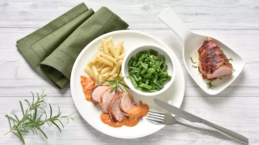 - Das Filet in kleine Medaillons, jedes Stück so 1,5 cm breit, schneiden, nebeneinander in eine leicht gebutterte Ofenform legen.