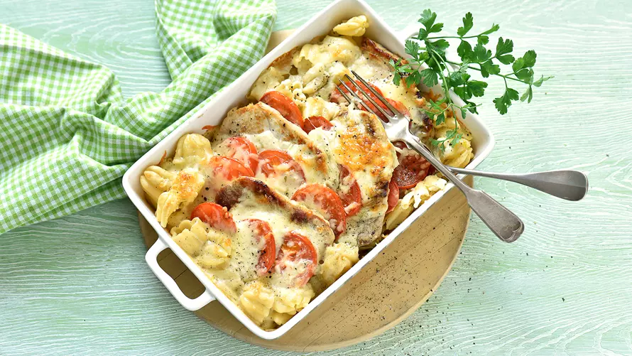 - Auflaufform mit etwas Soße füllen, die Lendchen mit Knoblauch und Zwiebeln hineinlegen und anschließend mit Nudeln, Tomaten und Käse bedecken.