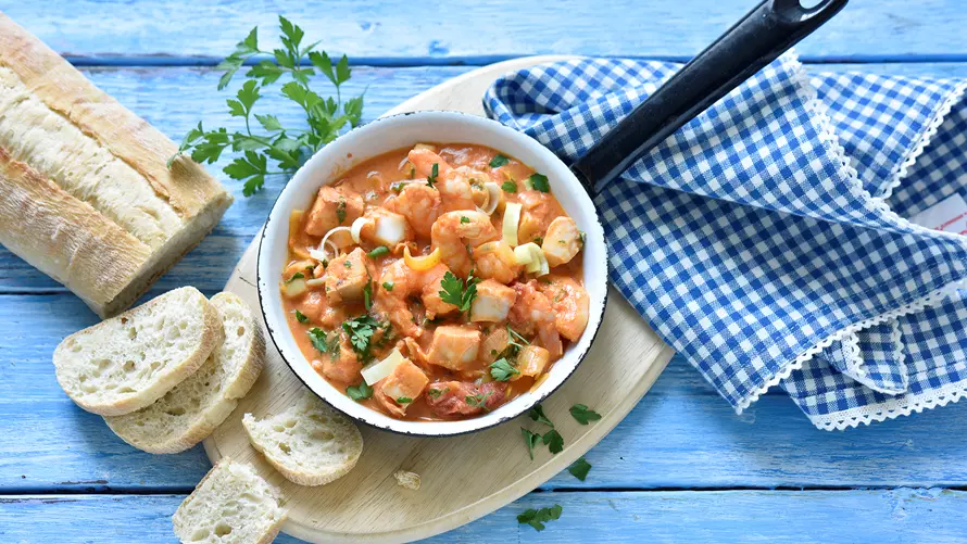 - Pacific Prawns unterheben und erwärmen. Fischpfanne in eine Servierschüssel geben, mit Petersilie bestreuen.