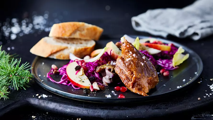- Anschließend den Rotkohl und Chicorée in eine große Schüssel geben. Die Früchte und Nüsse hinzufügen. Den Salat nach Belieben mit dem selbstgemachten Dressing würzen. Abschließend den Salat auf einem Teller mit der warmen Ente und dem geschnittenen Baguette anrichten.